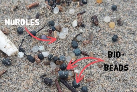 While Bio-beads look similar to nurdles (also known as mermaid tears), they are not the same. Nurdles are smooth, oval or round pre-production or virgin plastics that’s used to make new plastic products, these are often clear, white or bright colours. Bio-beads are irregular, rough, cylindrical pellets – often blue, black, grey or white.